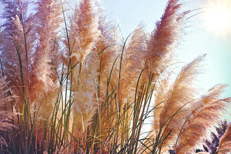 Autumn landscape on a sunny day. Field with dry autumn grass. Pampas grass outdoor in light pastel colors.