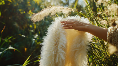 A fluffy shirt hanging in a breezy outdoor setting, with a hand gently touching its soft fabric, enjoying the crisp, fresh scent of the air.