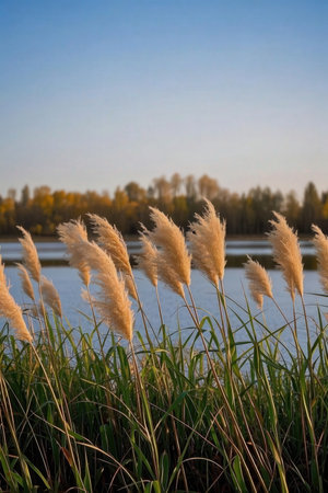 Ornamental pampas grass plumes swaying in the gentle breeze by a tranquil lake, creating a serene natural scene