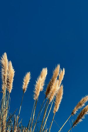 Pampas grass or Cortaderia selloana. Thick and fluffy plant on clear blue sky background.