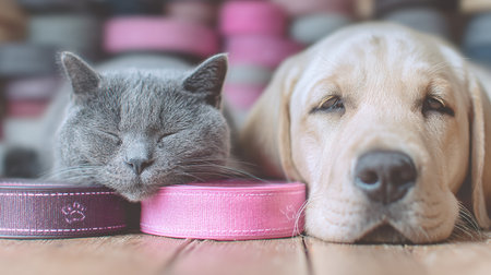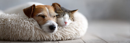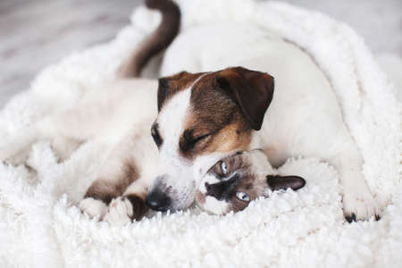 Cat and dog together on white plaid. Friendship kitten and puppy. Dog sleeping on cat
