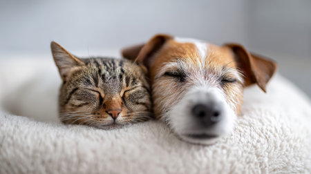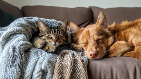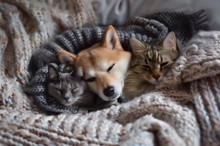 A sweet canine and feline share warmth, gentle embraces on a soft gray blanket, creating a heartwarming scene of friendship and comfort.