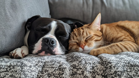 Bull Terrier and Cat Relaxing Together at Home