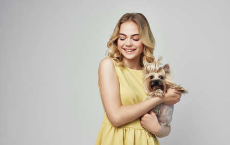 woman in a yellow dress fun a small dog cropped view fashion