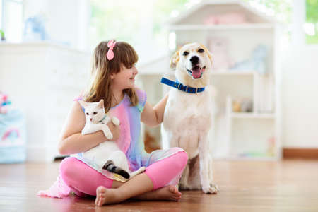 Child playing with cat and dog. Kids play with puppy and kitten. Little girl and large dog at home. Children and friendship. Kid sitting on the floor with pet. Animal care