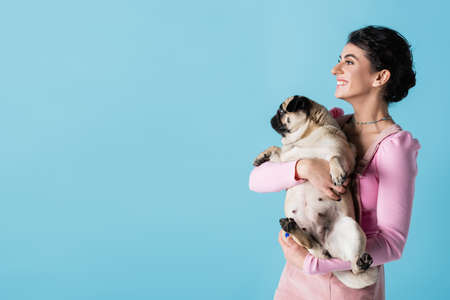 cheerful and stylish woman with pug dog in hands looking away isolated on blue