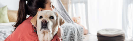 preteen girl embracing labrador dog at home, banner