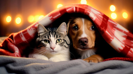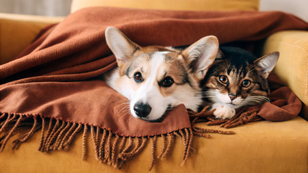 Cute dog and cat under blanket on sofa at home, closeup