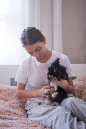 A teenage girl sits on a soft, fluffy bed, lovingly grooming her dark-colored rabbit. She uses a small grooming tool. The scene is intimate and peaceful.