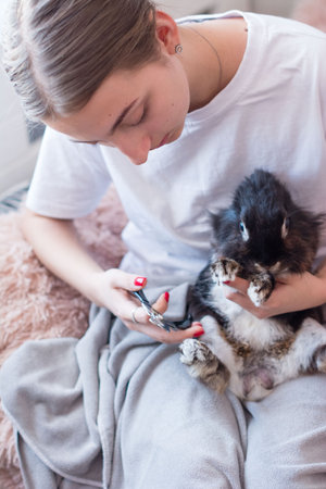 A teenage girl gently clips her pet rabbit's claws. She sits on a grey blanket, showing care and attention to the animal's well-being.