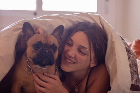 Happy woman with french bulldog while laying inside a bed