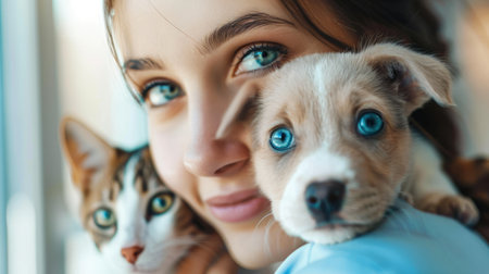 A warm moment as a person holds a cat and a dog closely, highlighting their bond and intimacy.