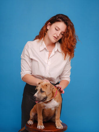 beautiful redhead woman with Cute puppy American Staffordshire Terrier posing in studio over blue background. Concept of care, education, obedience training, raising pets
