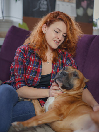 Happy woman petting her merican staffordshire terrier on couch at home in living room. pet and owner having good time together at home, living room interior,