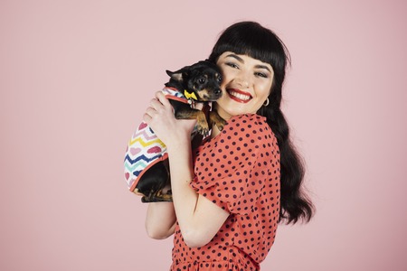 Attractive woman with makeup holds little dog or puppy on pink background.