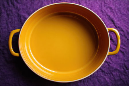 Top view of yellow soup bowl on purple background. Copy space.