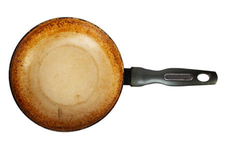Dirty old frying pan. Isolated on white background. File contains clipping path. Top view.