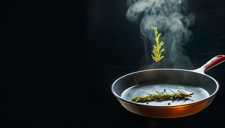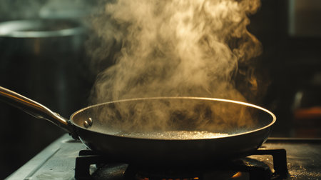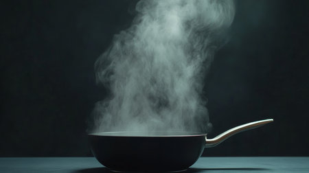 Hot steam rising from a black frying pan on a kitchen counter, set against a dark background, creates a dramatic and evocative atmosphere perfect for culinary inspiration