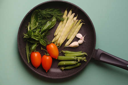 organic fresh vegetables courgette, tomato, asparagus, basil, dill, green peas, garlic in a frying pan