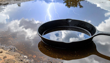 A forgotten cast iron skillet sits in a rain puddle, but its surface holds a dramatic secret.