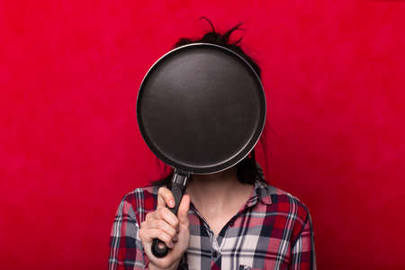 beautiful girl holds a frying pan in hands
