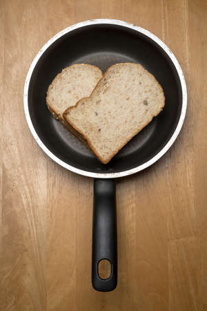 Two slices of bread in a frying pan on a wooden background.