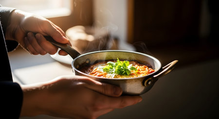 Close-up of hands holding a small metal pan filled with a hot, steaming dish garnished with fresh herbs. The food is illuminated by natural window light, emphasizing its freshness and the warmth of a homemade meal.