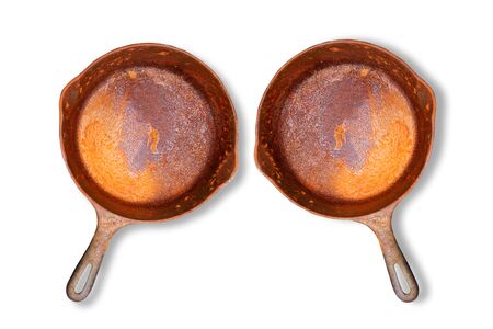 Two rusted cast iron pan isolated on white background