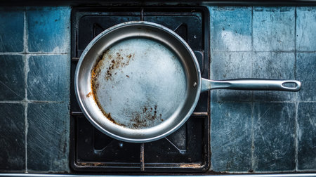 A detailed overhead image of a stainless steel frying pan resting on a stovetop with an aged and grimy surface, showcasing signs of use in a kitchen environment.