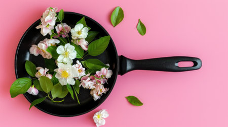 A striking arrangement of colorful flowers and green leaves displayed in a black frying pan against a vibrant pink background, perfect for creative projects.