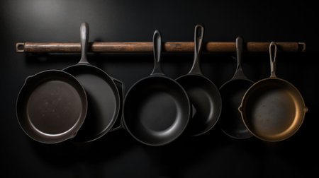 Various non-stick frying pans with handles in a row, chrome-plated, dark background. Header banner mockup with copy space. AI generated.