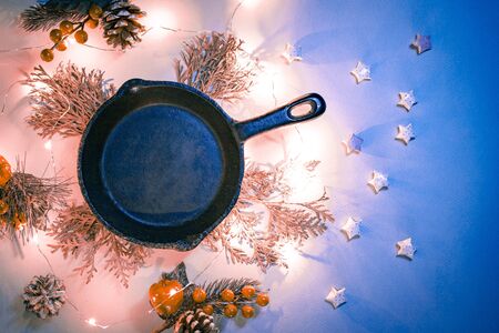 Christmas table setting with empty iron pan with christmas light and thuja branches . Winter holidays and festive background. Christmas eve dinner, New Year food lunch. Top view