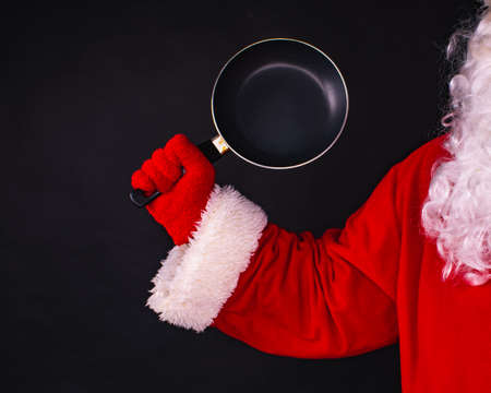 Close up photo of Santa Claus hand holding a frying pan on a black background, cooking dinner, healthy food. Part of the body,