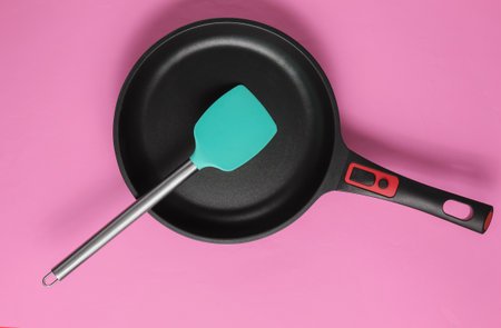Non-stick pan with cooking spatula on pink background. Cooking minimalism concept. Studio shot. Top view