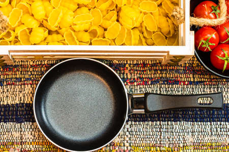 Beautiful tasty Italian pasta, tomatoes, onions and garlic for cooking pasta