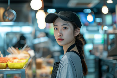 Portrait of a young woman wearing a cap, standing in a busy market with food in the background