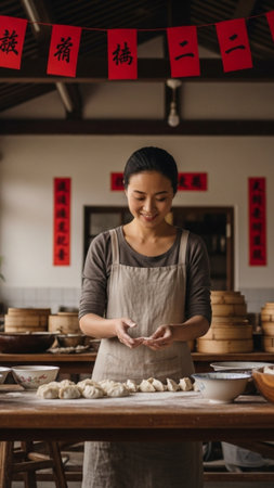 A vertically composed, full-body shot of a woman fully engaged in folding dumplings in a vibrant, tr