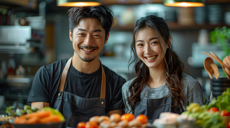 Two attractive Asian males, both wearing casual attire and an apron, are cooking together in their home's kitchen while grinning broadly.