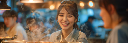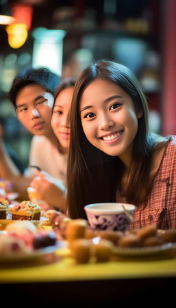 A group of diners sitting around a table, savoring bowls of hot tom yum soup, with steam rising and smiles of satisfaction on their faces