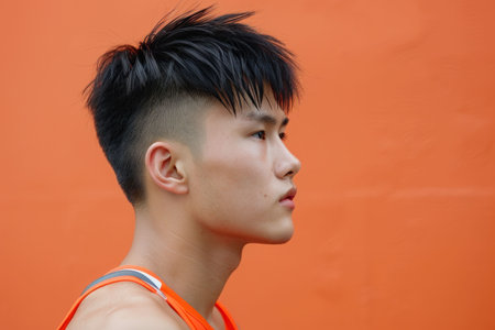 Asian man in orange tank top turning his head to the side, portrait of a young male in casual summer clothing