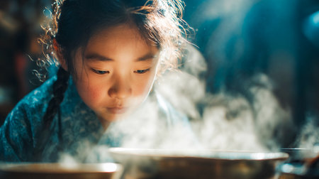 Young Asian girl enjoying hot homemade soup, child looking at steaming bowl in warm family atmosphere, traditional Asian meal and cozy authentic lifestyle. Korean family enjoying traditional hot soup.