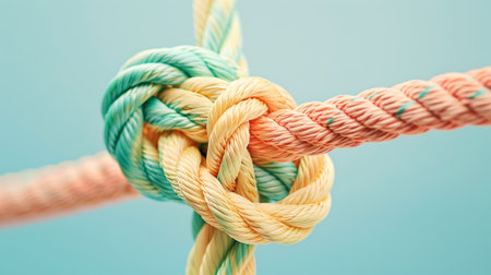 Strong climbing knot with pastel colored ropes on clean light background. Team building concept. Generative AI.
