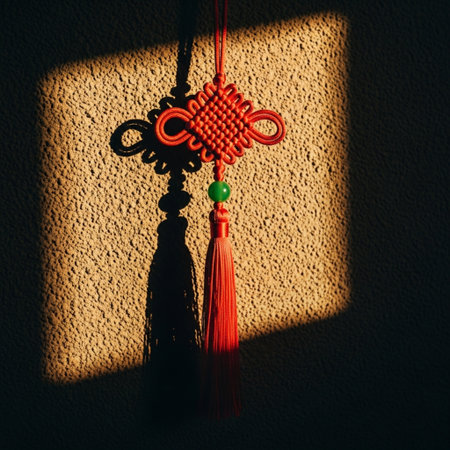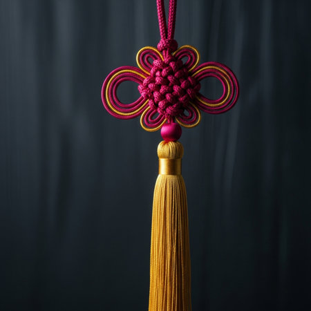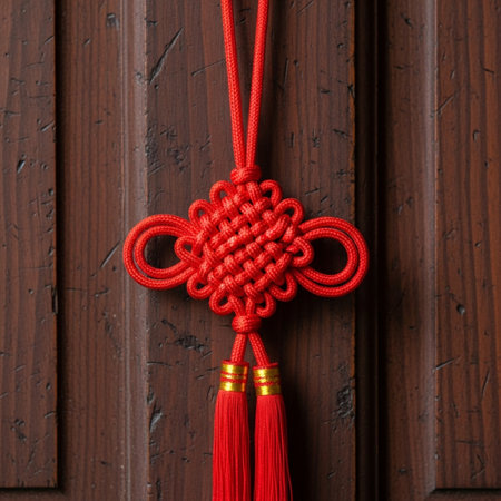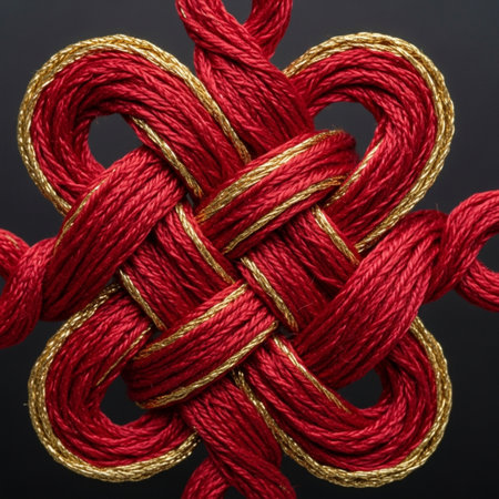 A close-up of traditional Chinese knotting with red silk cords. No people, copy space.