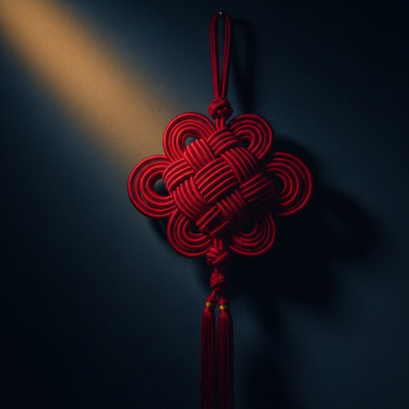 An editorial, photorealistic image of a perfect, handcrafted Chinese Mystic Knot (Pan Chang) woven f
