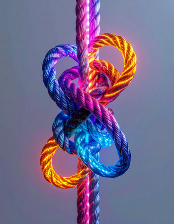 Intertwined ropes of diverse colors symbolize unity and synergy in teamwork, forming a strong, cohesive bond.
