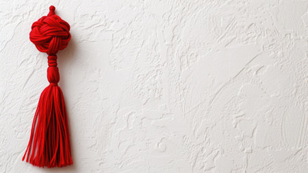 Red tassel Baba Marta symbol Martenitsa on white card. International Martisor day celebrate spring arrival. Copy space