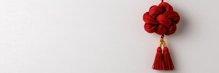 A single large red knot decoration with golden tassels hanging elegantly in the center of a pristine white background