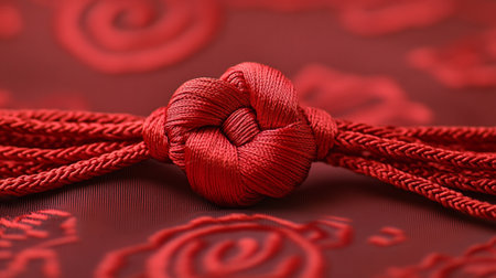 This image features a stunning red decorative knot, highlighting intricate craftsmanship and cultural significance in textile design. The symmetrical pattern showcases artistry and creativity in handmade cord work, making it a versatile decorative element.