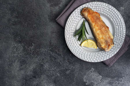 Fried fish hake Pollock and slices of fresh lemon. Dark concrete background. Copy space