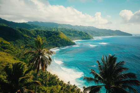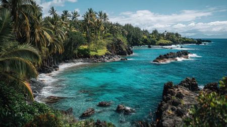 Discover a stunning ocean view showcasing tropical palm trees along a rocky coastline, vibrant blue water, and a bright sky, embodying a tranquil paradise escape.